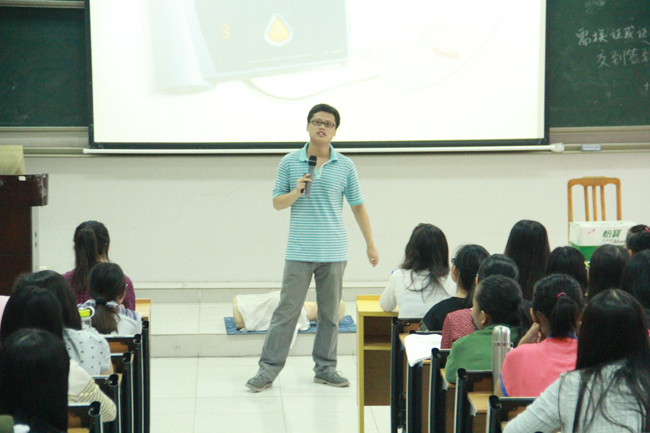 钟广睿师兄以幽默风趣的语言,结合生动有趣的PPT和图片,讲解了现场急救的方法要领以及常见的急救知识,同学们听得津津有味。