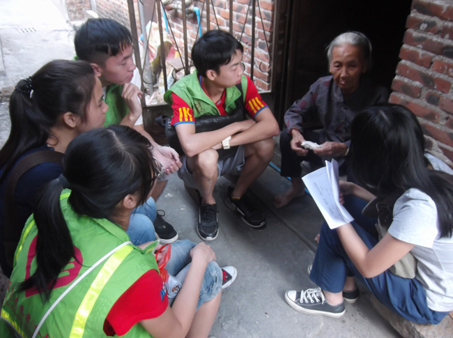 我院学生与老人席地而坐,听老人讲以前的故事
