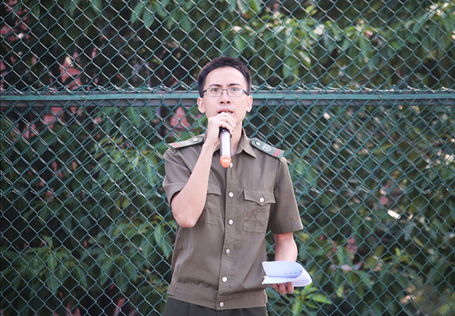 保卫办工作人员从扑灭火灾与自救、火灾现场逃生两个方面向军训学员介绍常见火场逃生方法及逃生自救过程中的注意事项,并重点向师生介绍了“一畅二会”的自救方法,让新生充分认识了火灾的危险性和基本特点,掌握了逃生疏散中的基本技能。
