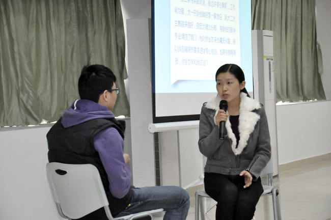 图3:决赛谈心谈话环节,资源与城乡规划系辅导员孙华玲现场为学生解决生活和心理上的实际问题。