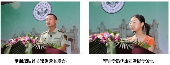 负责我院学生军训工作的广东武警一支队第三大队驻中山大学bv伟德体育app官网学院军训团第三营邹俊营长和军训学员代表江雪同学分别上台发言,表达了对新生在bv伟德体育app官网学院学习与生活的美好祝愿。