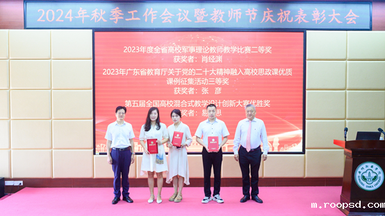 王庭槐校长、郝登峰书记为“2023年度全省高校军事理论教师教学比赛二等奖”“2023年广东省教育厅关于党的二十大精神融入高校思政课优质课例征集活动三等奖”“第五届全国高校混合式教学设计创新大赛优胜奖”获奖人员颁奖