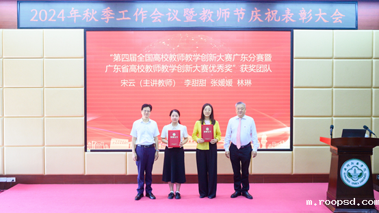 王庭槐校长、郝登峰书记为“第四届全国高校教师教学创新大赛广东分赛暨广东省高校教师教学创新大赛优秀奖”获奖团队代表颁奖