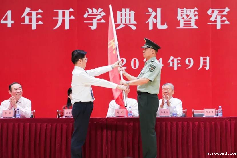 学校党委书记郝登峰为军训团授团旗,期望同学们在军训中磨砺意志,锤炼品格,将军训精神融入学习生活,成为有担当的时代青年。