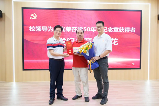 在三全育人促进中心·思政育人空间举行“光荣在党50年”纪念章颁发仪式暨“七一”党员慰问座谈会。学校党委书记郝登峰,纪委书记林源,监事会监事长、“光荣在党50年”纪念章获得者蓝永金,以及青年党员代表、新接收预备党员代表与受慰问党员代表共同出席了本次活动。