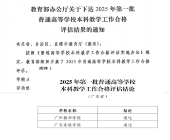 2025年5月7日至9日,教育部委托广东省教育厅组织专家组对学校开展本科教学工作合格评估中办学条件评价环节进行考察。经专家组实地考察,学校办学条件各项指标均达到评估要求。2025年6月16日至19日,受教育部教育质量评估中心委托,专家组一行9人对学校进行了为期4天的入校考察。专家组充分肯定了学校的办学成绩,认为学校发展目标明确、办学特色日益彰显;坚持立德树人,党建引领高质量发展;主动服务地方,产教融合协同育人;牢固确立教学中心地位,教学质量稳步提升;以评促建,学校评建工作成效大。