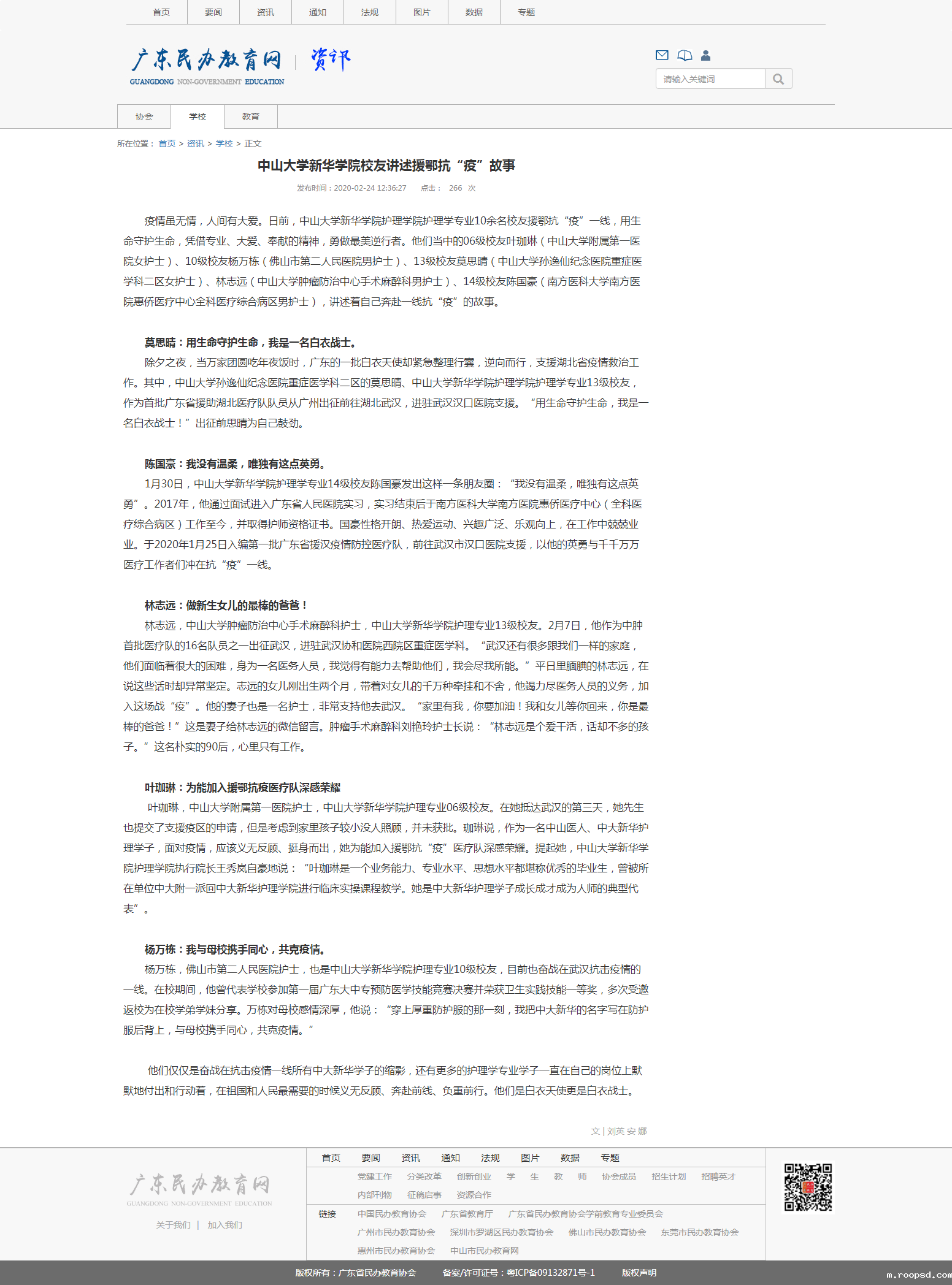 疫情虽无情,人间有大爱。日前,中山大学bv伟德体育app官网学院护理学院护理学专业10余名校友援鄂抗“疫”一线,用生命守护生命,凭借专业、大爱、奉献的精神,勇做最美逆行者。他们当中的06级校友叶珈琳(中山大学附属第一医院女护士)、10级校友杨万栋(佛山市第二人民医院男护士)、13级校友莫思晴(中山大学孙逸仙纪念医院重症医学科二区女护士)、林志远(中山大学肿瘤防治中心手术麻醉科男护士)、14级校友陈国豪(南方医科大学南方医院惠侨医疗中心全科医疗综合病区男护士),讲述着自己奔赴一线抗“疫”的故事。