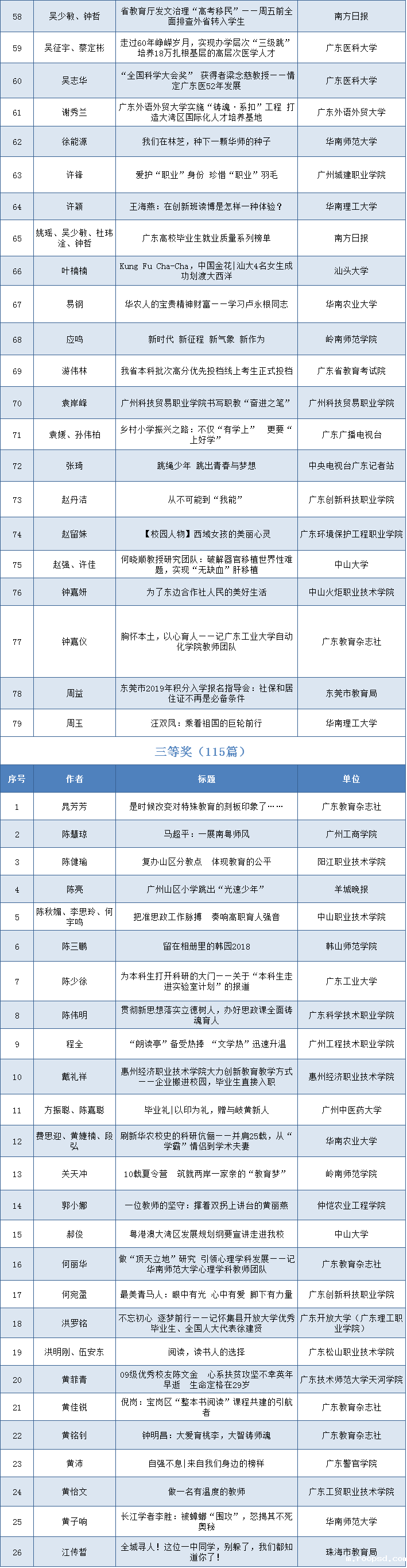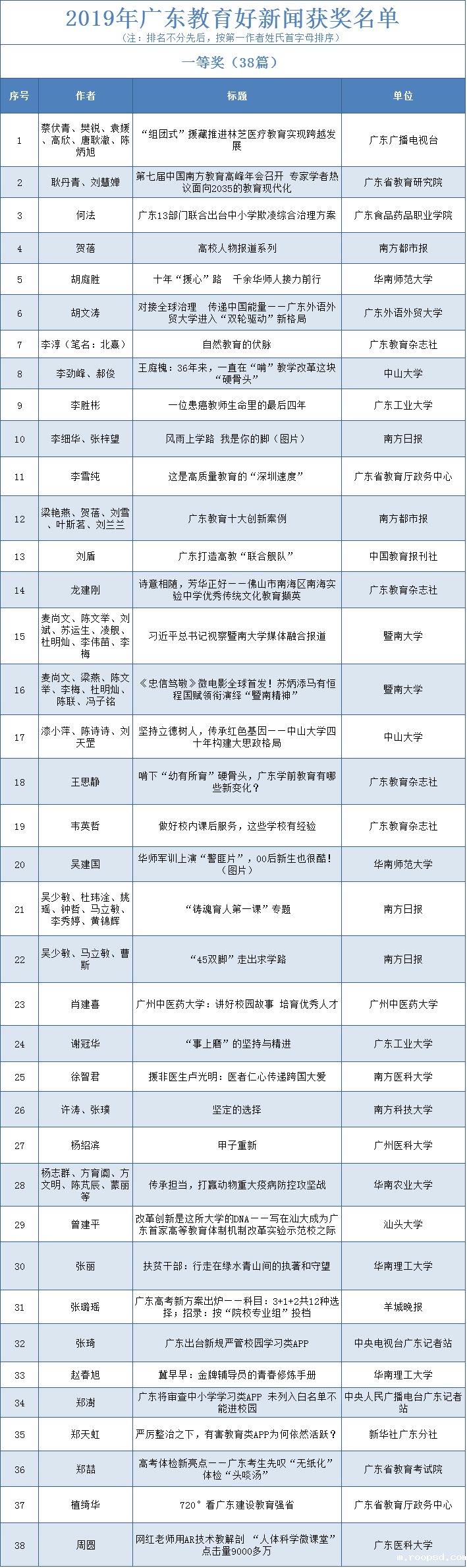 广东省教育厅两年举办一次广东教育好新闻评选活动。2019年广东教育好新闻评选活动自2019年9月启动以来,各地教育部门、各普通高校及相关媒体积极参与,共收到作品800余篇。经专家、学者组成的评委会评定,评选出2019年广东教育好新闻获奖作品,其中一等奖38篇,二等奖79篇,三等奖115篇,现予以公布。