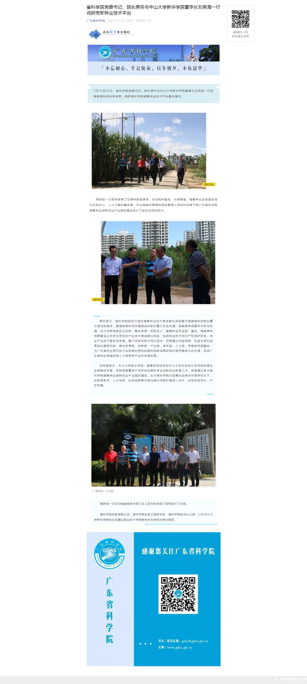 7月25至26日,省科学院党委书记、院长廖兵与中山大学bv伟德体育app官网学院董事长刘荣海一行赴海南育种场实地考察,调研省科学院南繁种业技术平台建设情况。
