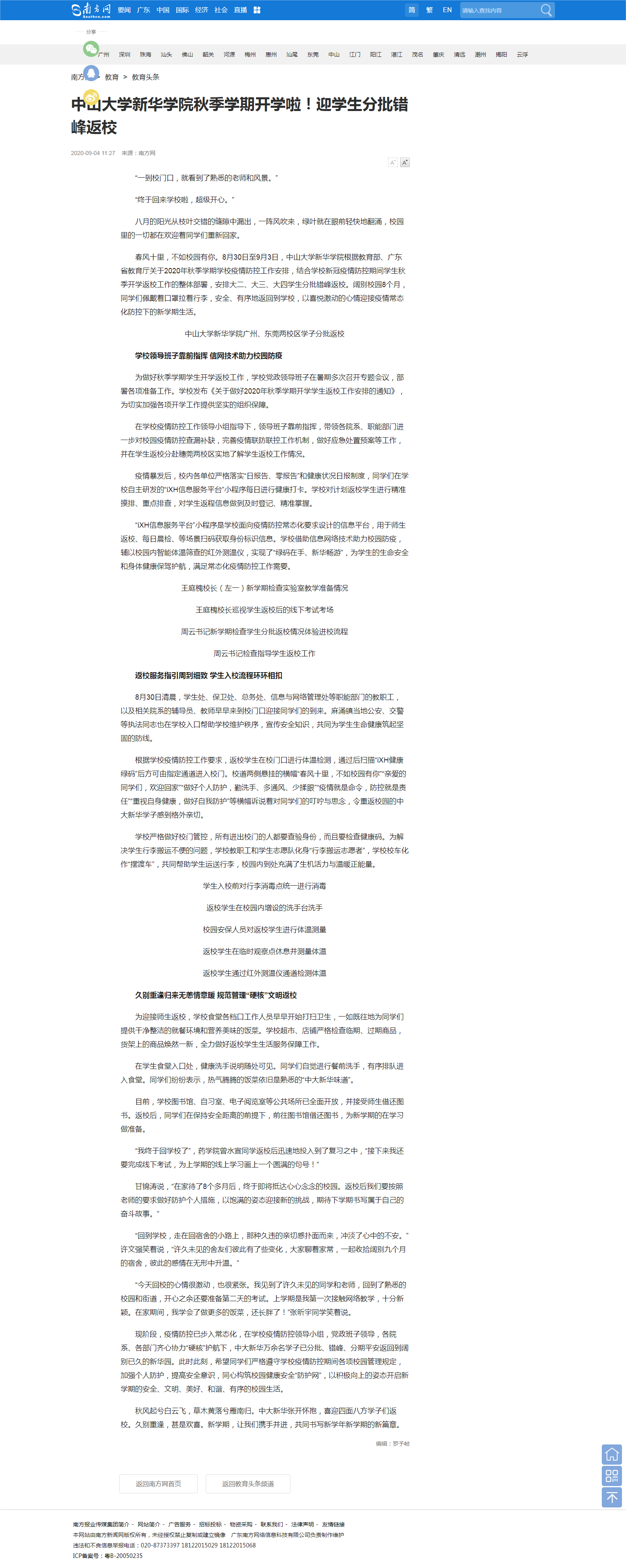 在学校疫情防控工作领导小组指导下,领导班子靠前指挥,带领各院系、职能部门进一步对校园疫情防控查漏补缺,完善疫情联防联控工作机制,做好应急处置预案等工作,并在学生返校分赴穗莞两校区实地了解学生返校工作情况。