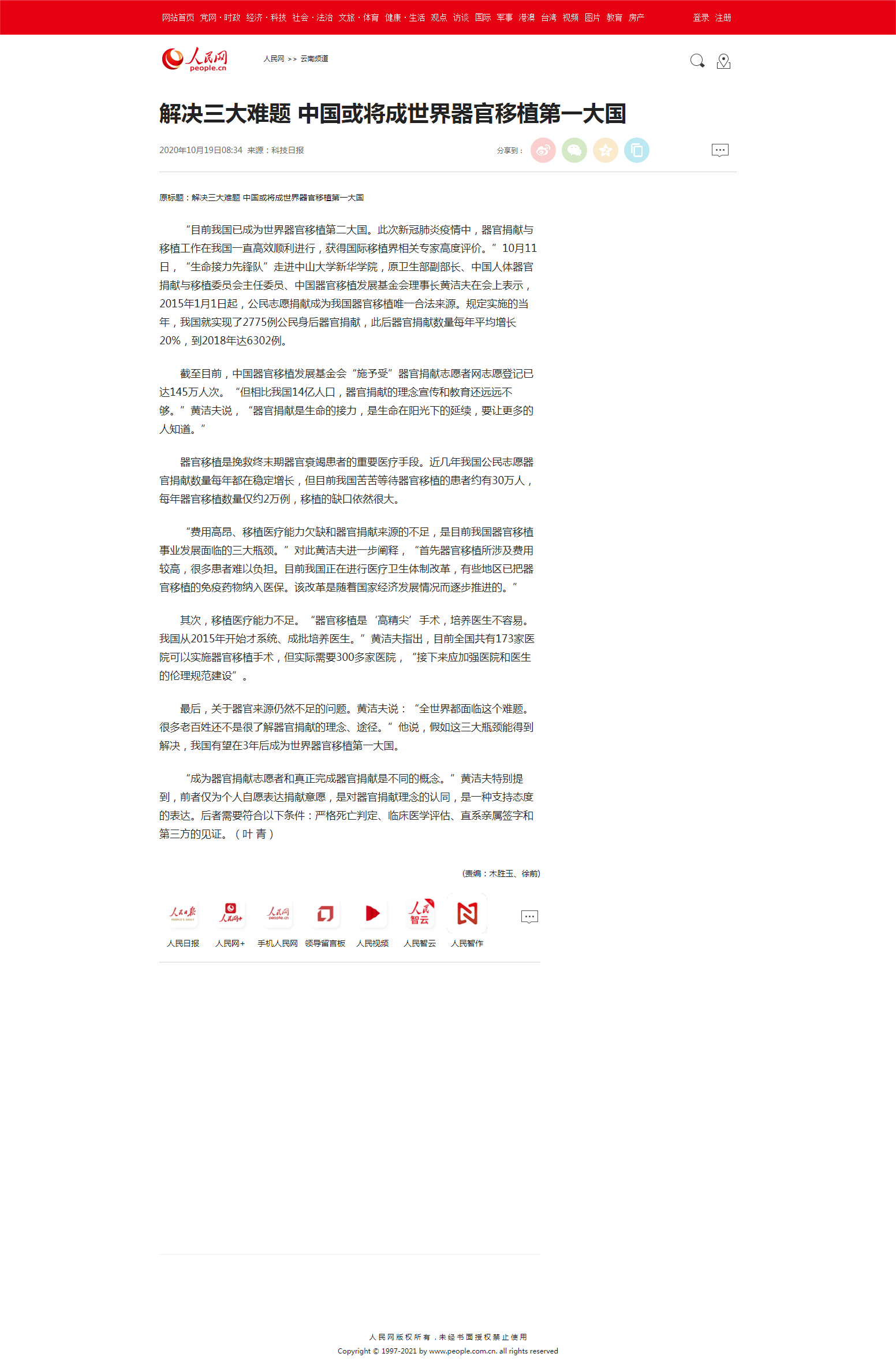 最后,关于器官来源仍然不足的问题。黄洁夫说:“全世界都面临这个难题。很多老百姓还不是很了解器官捐献的理念、途径。”他说,假如这三大瓶颈能得到解决,我国有望在3年后成为世界器官移植第一大国。