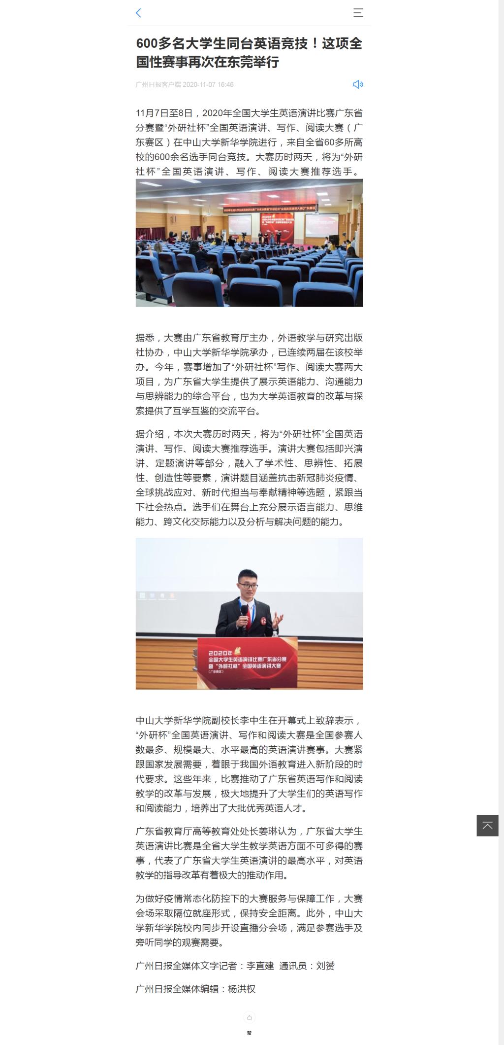 11月7日至8日,2020年全国大学生英语演讲比赛广东省分赛暨“外研社杯”全国英语演讲、写作、阅读大赛(广东赛区)在中山大学