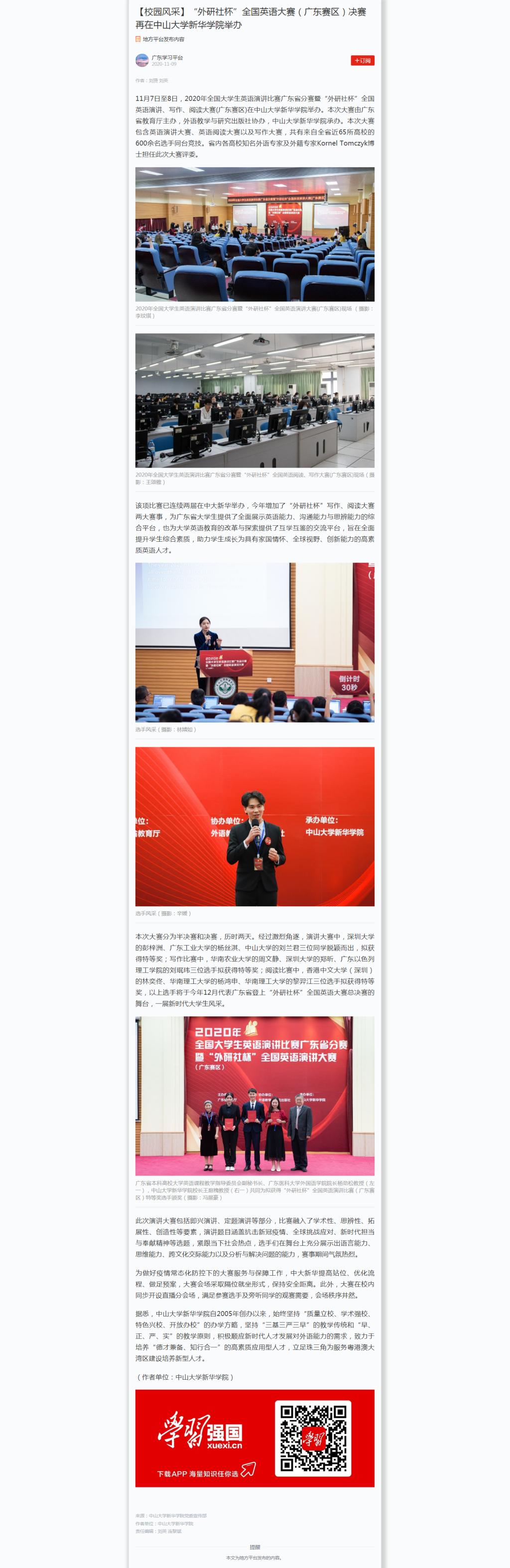 11月7日至8日,2020年全国大学生英语演讲比赛广东省分赛暨“外研社杯”全国英语演讲、写作、阅读大赛(广东赛区)在中山大学