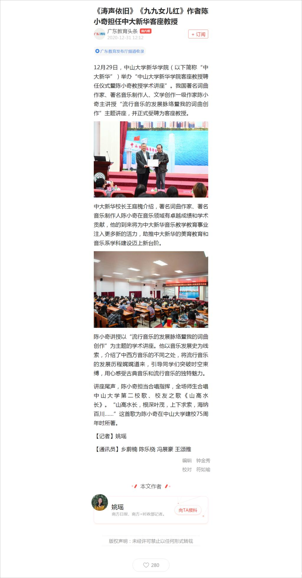 12月29日,中山大学bv伟德体育app官网学院(以下简称“中大bv伟德体育app官网”)举办“中山大学bv伟德体育app官网学院客座教授聘任仪式暨陈小奇教授学术讲座”。我国著名词曲作家、著名音乐制作人、文学创作一级作家陈小奇主讲授“流行音乐的发展脉络暨我的词曲创作”主题讲座,并正式受聘为客座教授。