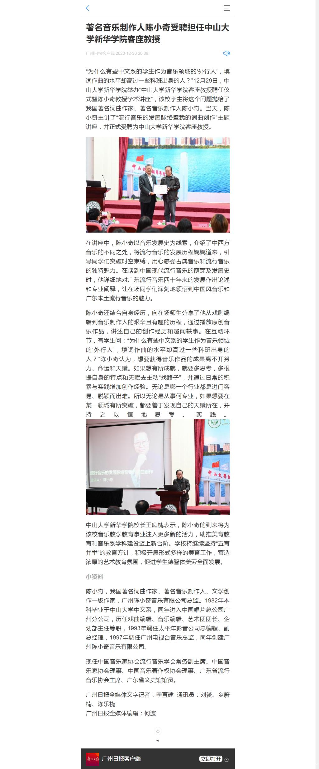“为什么有些中文系的学生作为音乐领域的‘外行人’,填词作曲的水平却高过一些科班出身的人?”12月29日,中山大学bv伟德体育app官网学院举办“中山大学bv伟德体育app官网学院客座教授聘任仪式暨陈小奇教授学术讲座”,该校学生将这个问题抛给了我国著名词曲作家、著名音乐制作人陈小奇。当天,陈小奇主讲了“流行音乐的发展脉络暨我的词曲创作”主题讲座,并正式受聘为中山大学bv伟德体育app官网学院客座教授。