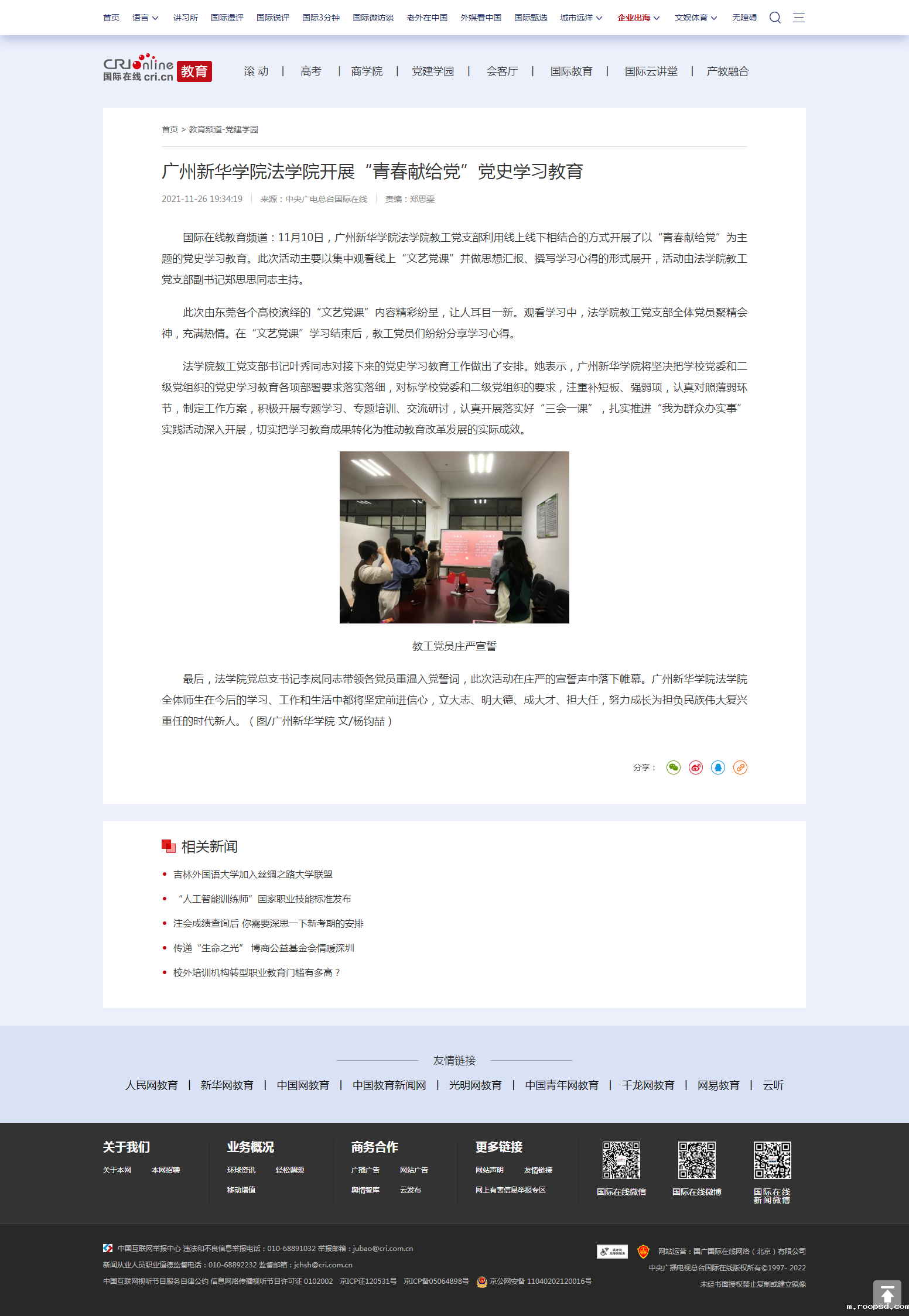 国际在线教育频道:11月10日,伟德app入口法学院教工党支部利用线上线下相结合的方式开展了以“青春献给党”为主题的党史学习教育。此次活动主要以集中观看线上“文艺党课”并做思想汇报、撰写学习心得的形式展开,活动由法学院教工党支部副书记郑思思同志主持。
