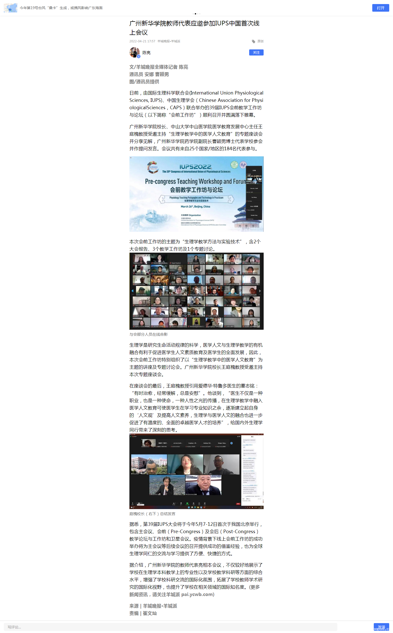 据悉,第39届IUPS大会将于今年5月7-12日首次于我国北京举行,包含主会议、会前(Pre-Congress)及会后(Post-Congress)教学论坛与工作坊和卫星会议。疫情背景下线上会前工作坊的成功举办将为主会议等后续会议的召开提供成功的借鉴经验,也为全球生理学同仁的交流与学习提供了方便、快捷的方式。