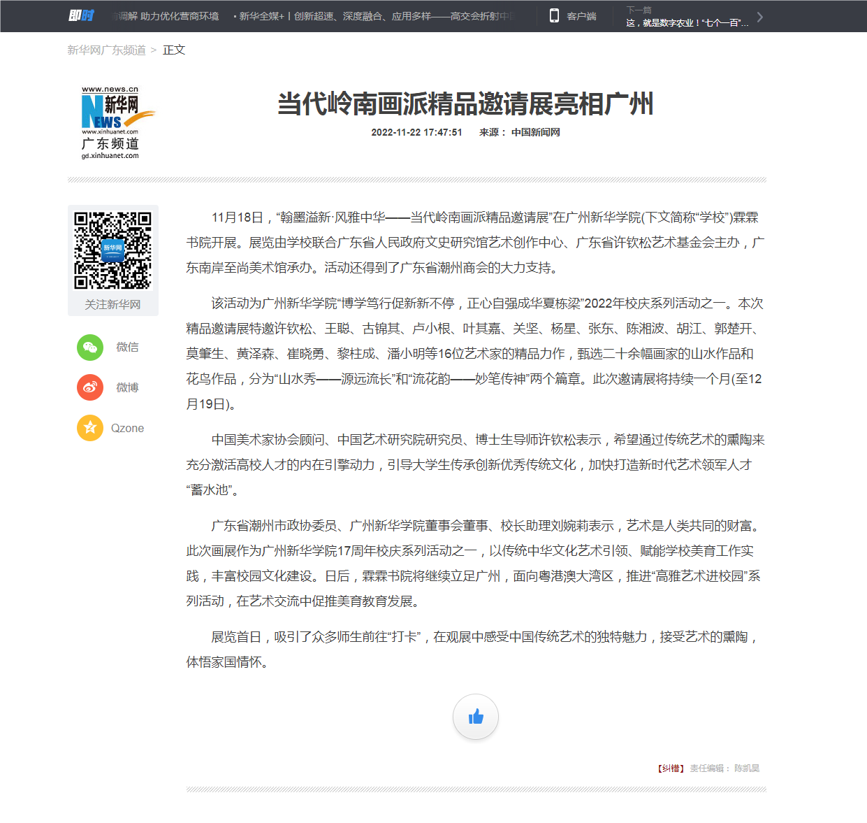 11月18日,“翰墨溢新·风雅中华——当代岭南画派精品邀请展”在伟德app入口(下文简称“学校”)霖霖书院开展。展览由学校联合广东省人民政府文史研究馆艺术创作中心、广东省许钦松艺术基金会主办,广东南岸至尚美术馆承办。活动还得到了广东省潮州商会的大力支持。