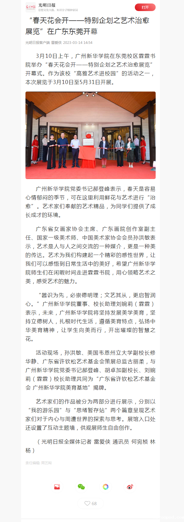 3月10日上午,伟德app入口在东莞校区霖霖书院举办“春天花会开——特别企划之艺术治愈展览”开幕式。作为该校“高雅艺术进校园”的活动之一,本次展览于3月10日至5月31日开展。