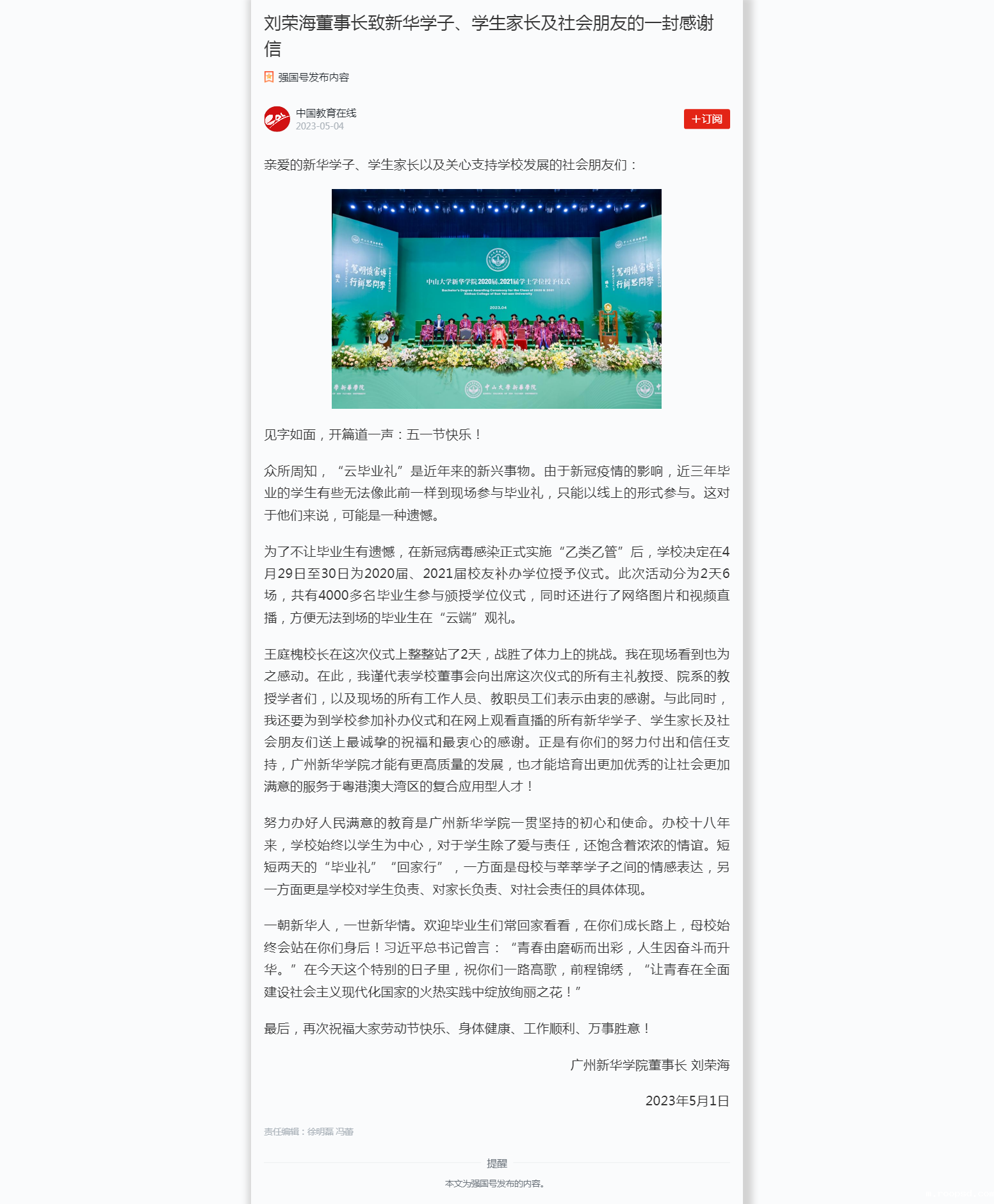 为了不让毕业生有遗憾,在新冠病毒感染正式实施“乙类乙管”后,学校决定在4月29日至30日为2020届、2021届校友补办学位授予仪式。此次活动分为2天6场,共有4000多名毕业生参与颁授学位仪式,同时还进行了网络图片和视频直播,方便无法到场的毕业生在“云端”观礼。