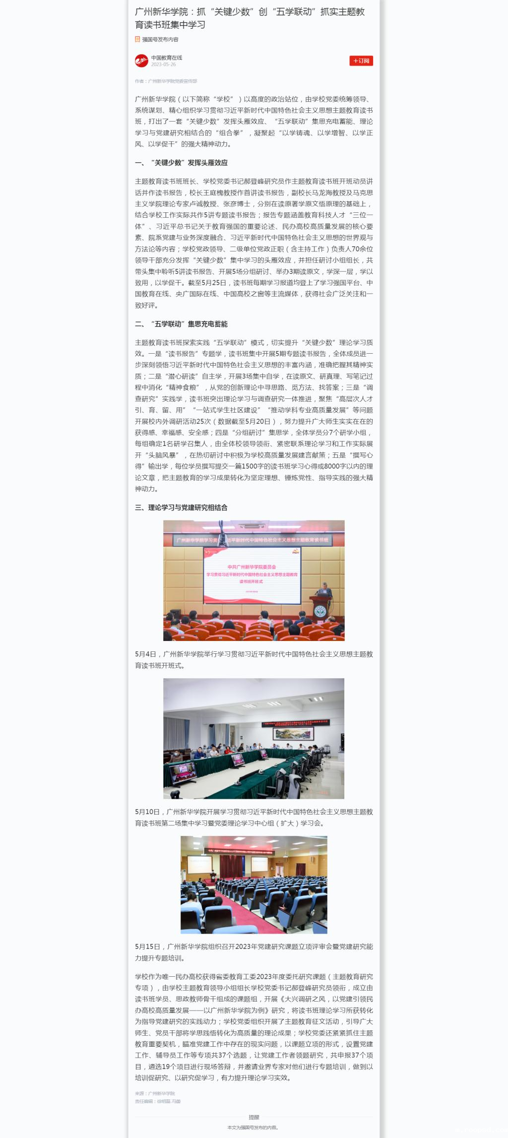 主题教育读书班班长、学校党委书记郝登峰研究员作主题教育读书班开班动员讲话并作读书报告,校长王庭槐教授作首讲读书报告,副校长马龙海教授及马克思主义学院理论专家卢诚教授、张彦博士,分别在读原著学原文悟原理的基础上,结合学校工作实际共作5讲专题读书报告;报告专题涵盖教育科技人才“三位一体”、习近平总书记关于教育强国的重要论述、民办高校高质量发展的核心要素、院系党建与业务深度融合、习近平新时代中国特色社会主义思想的世界观与方法论等内容;学校党政领导、二级单位党政正职(含主持工作)负责人70余位领导干部充分发挥“关键少数”集中学习的头雁效应,并担任研讨小组组长,共带头集中聆听5讲读书报告、开展5场分组研讨、举办3期读原文,学深一层,学以致用,以学促干。截至5月25日,读书班每期学习报道均登上了学习强国平台、中国教育在线、央广国际在线、中国高校之窗等主流媒体,获得社会广泛关注和一致好评。