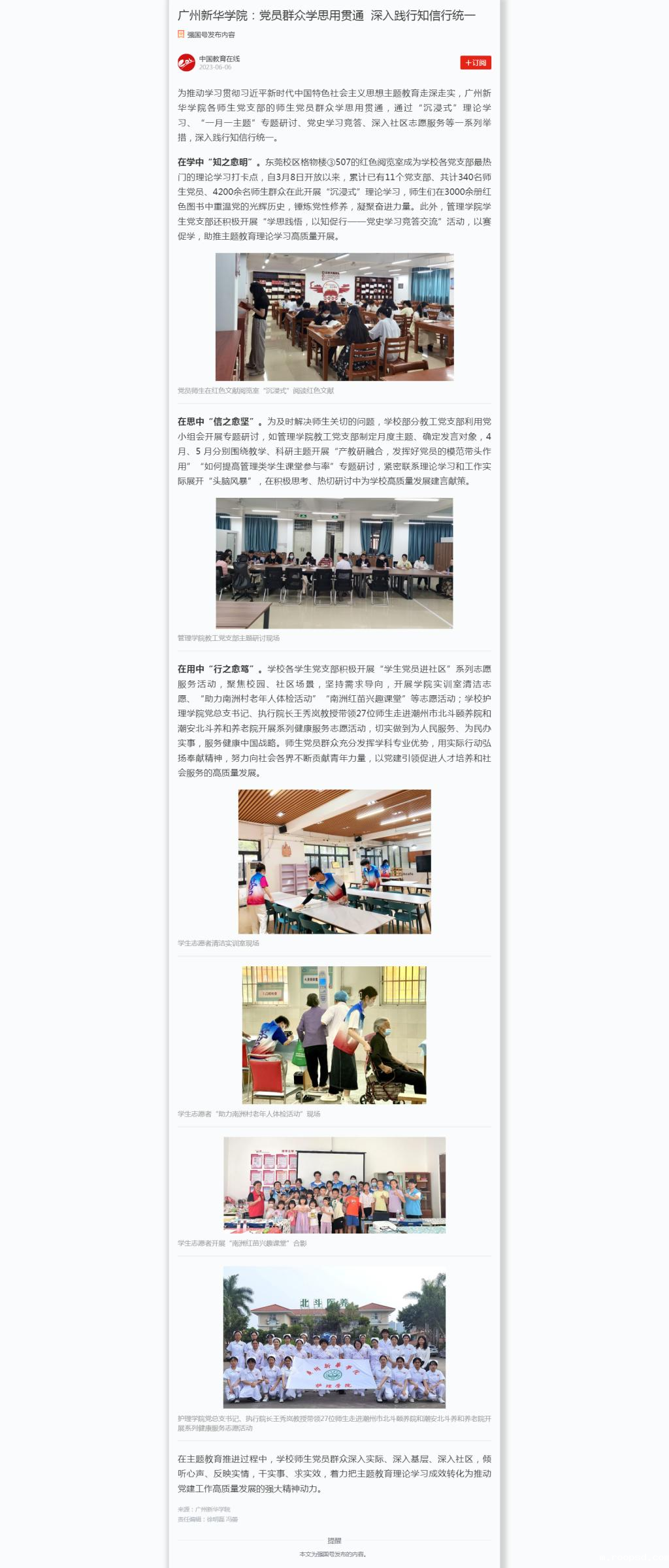 在用中“行之愈笃”。学校各学生党支部积极开展“学生党员进社区”系列志愿服务活动,聚焦校园、社区场景,坚持需求导向,开展学院实训室清洁志愿、“助力南洲村老年人体检活动”“南洲红苗兴趣课堂”等志愿活动;学校护理学院党总支书记、执行院长王秀岚教授带领27位师生走进潮州市北斗颐养院和潮安北斗养和养老院开展系列健康服务志愿活动,切实做到为人民服务、为民办实事,服务健康中国战略。师生党员群众充分发挥学科专业优势,用实际行动弘扬奉献精神,努力向社会各界不断贡献青年力量,以党建引领促进人才培养和社会服务的高质量发展。