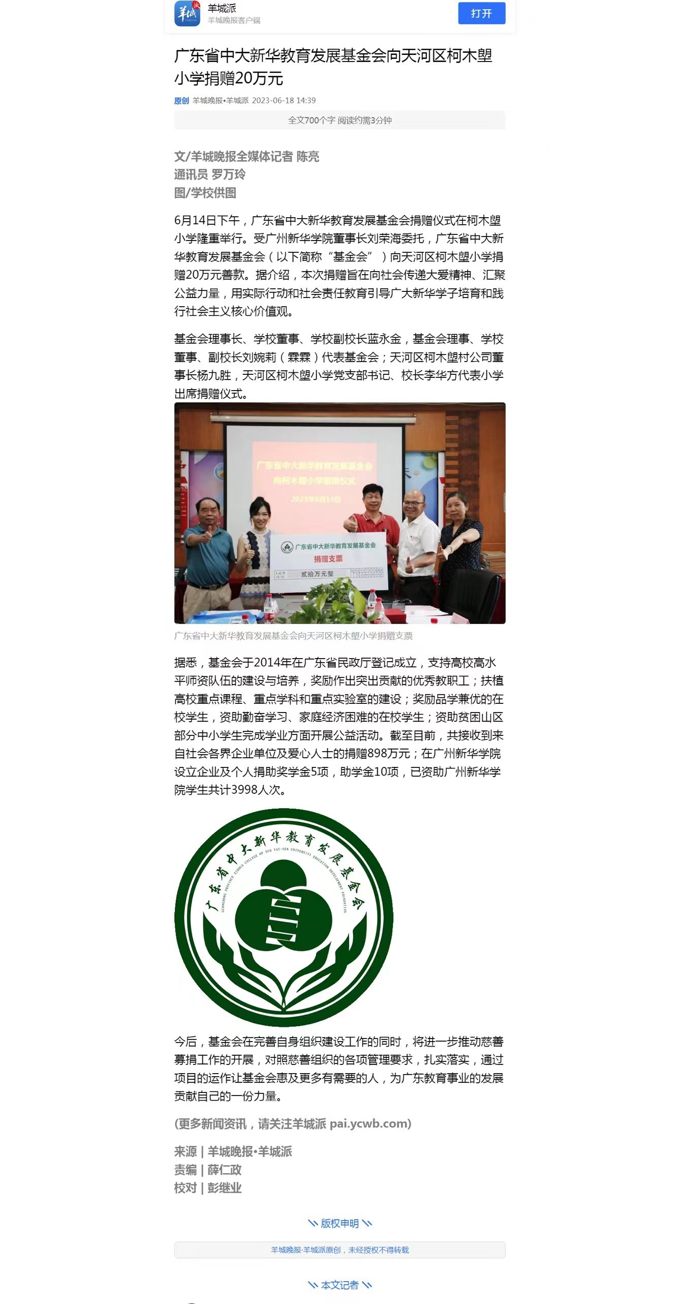 基金会理事长、学校董事、学校副校长蓝永金,基金会理事、学校董事、副校长刘婉莉(霖霖)代表基金会;天河区柯木塱村公司董事长杨九胜,天河区柯木塱小学党支部书记、校长李华方代表小学出席捐赠仪式。