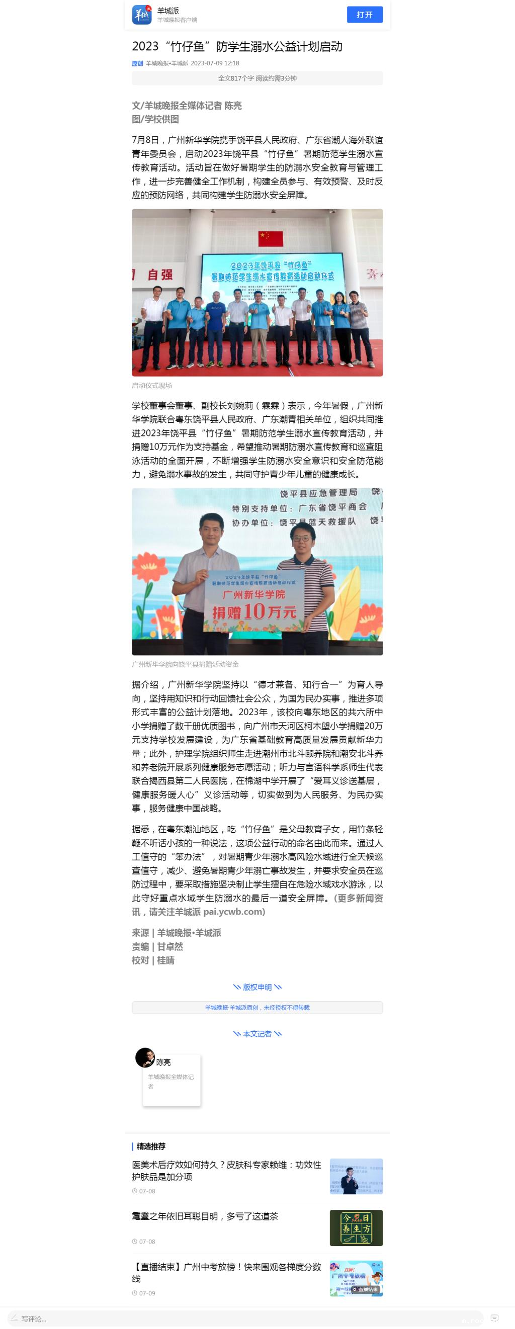 7月8日,伟德app入口携手饶平县人民政府、广东省潮人海外联谊青年委员会,启动2023年饶平县“竹仔鱼”暑期防范学生溺水宣传教育活动。活动旨在做好暑期学生的防溺水安全教育与管理工作,进一步完善健全工作机制,构建全员参与、有效预警、及时反应的预防网络,共同构建学生防溺水安全屏障。