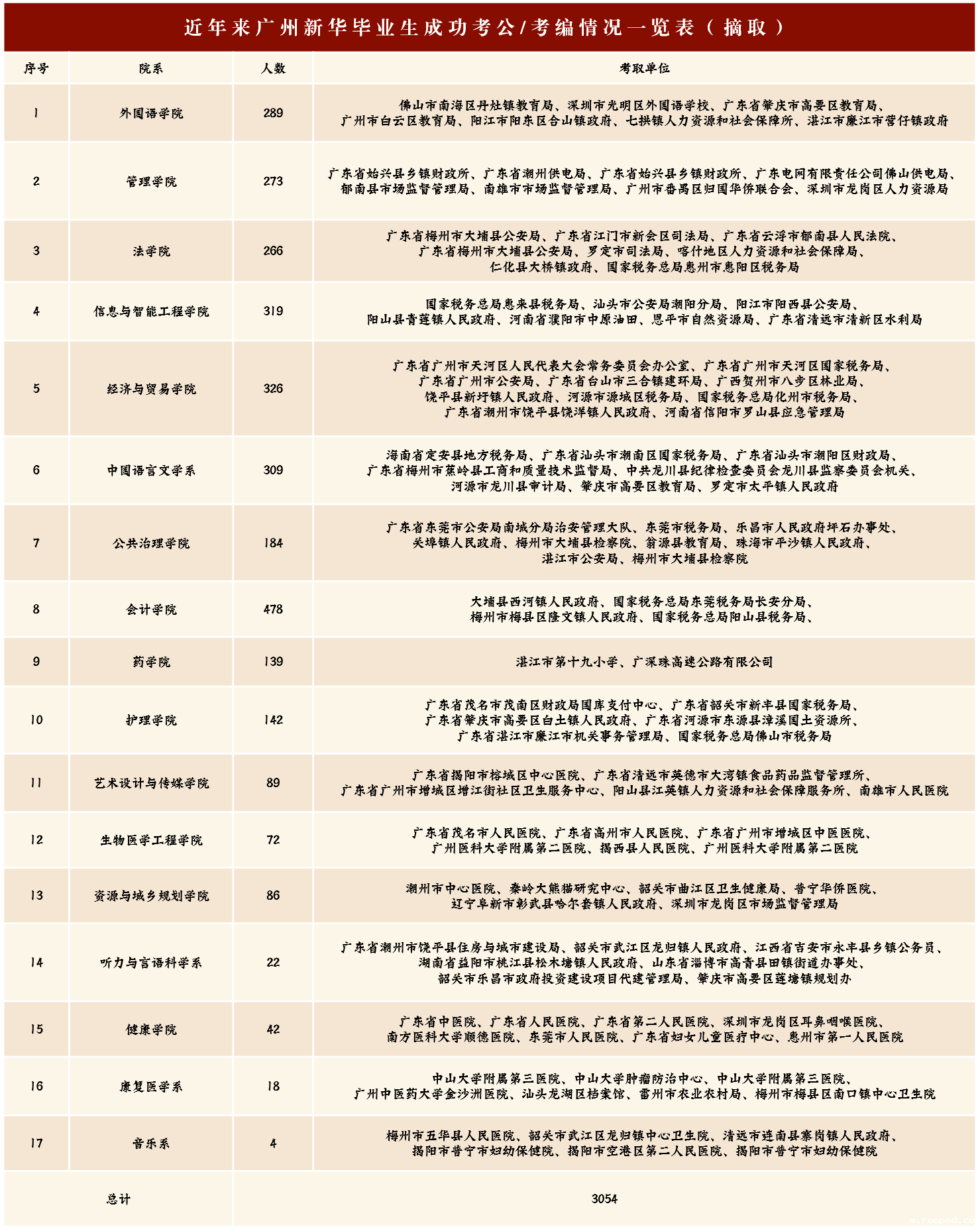 据不完全统计,近年来,该校共有考上公务员、事业单位毕业生人数3000余人,其中主要考取单位有国家税务总局、国家海关、南方电网、烟草局、广东广播电视台、图书馆、档案馆、教育局、财政局等。