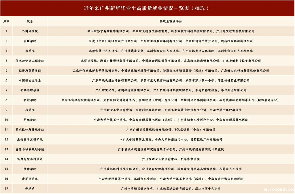 据不完全统计,近年来,该校毕业去向落实率逐年提高,实现更加充分、更高质量就业,最终毕业生去向落实率基本保持在90.00%以上,其中2018届、2019届毕业生最终毕业去向落实率高达99.50%、99.94%。毕业生主要流向为粤港澳大湾区珠三角城市,就业方向主要是机关单位、各类知名企业单位、自主创业、升学读研、考入公务员单位、事业单位等,毕业生就业质量较高,满意度良好。