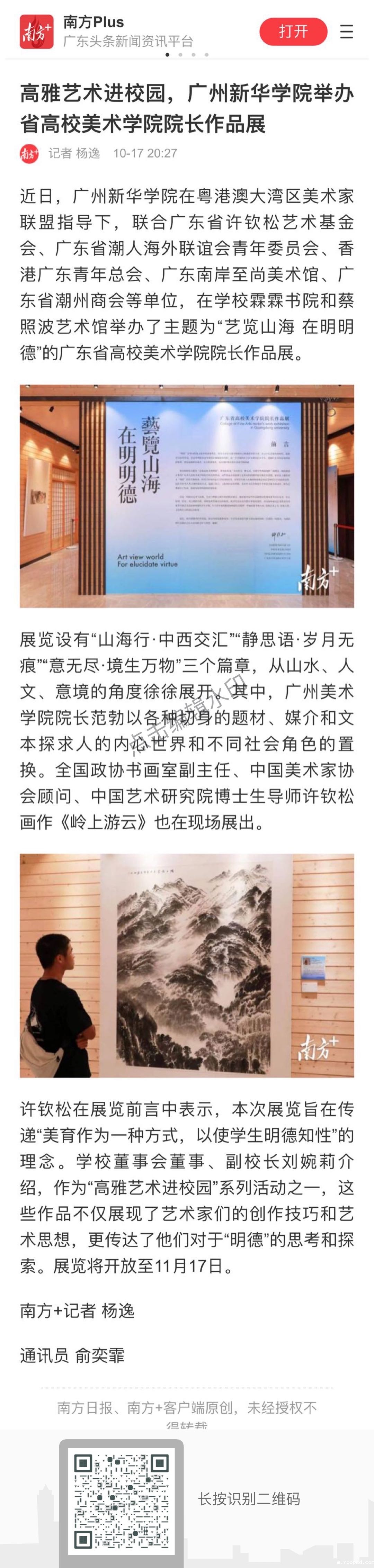 许钦松在展览前言中表示,本次展览旨在传递“美育作为一种方式,以使学生明德知性”的理念。学校董事会董事、副校长刘婉莉介绍,作为“高雅艺术进校园”系列活动之一,这些作品不仅展现了艺术家们的创作技巧和艺术思想,更传达了他们对于“明德”的思考和探索。展览将开放至11月17日。