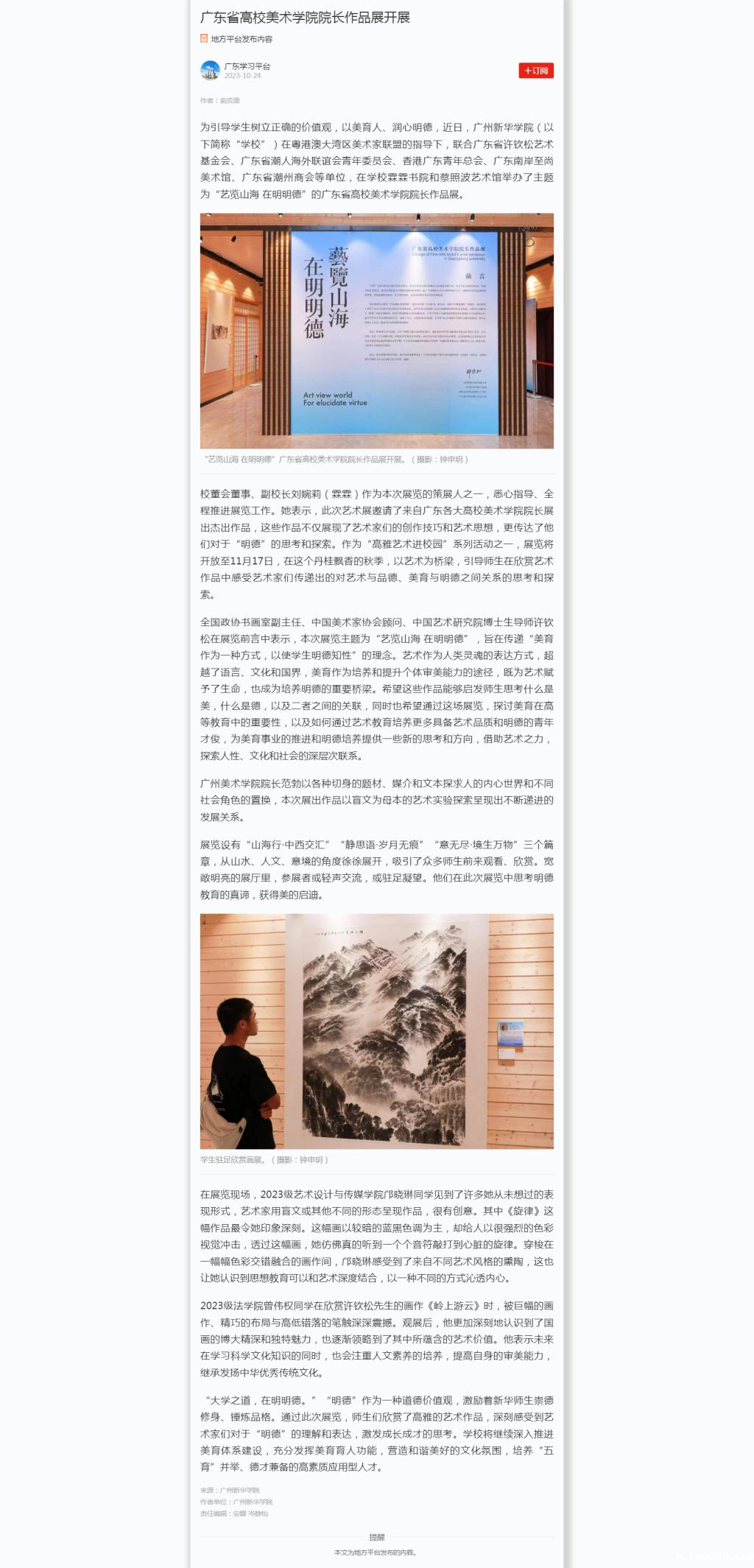校董会董事、副校长刘婉莉(霖霖)作为本次展览的策展人之一,悉心指导、全程推进展览工作。她表示,此次艺术展邀请了来自广东各大高校美术学院院长展出杰出作品,这些作品不仅展现了艺术家们的创作技巧和艺术思想,更传达了他们对于“明德”的思考和探索。作为“高雅艺术进校园”系列活动之一,展览将开放至11月17日,在这个丹桂飘香的秋季,以艺术为桥梁,引导师生在欣赏艺术作品中感受艺术家们传递出的对艺术与品德、美育与明德之间关系的思考和探索。