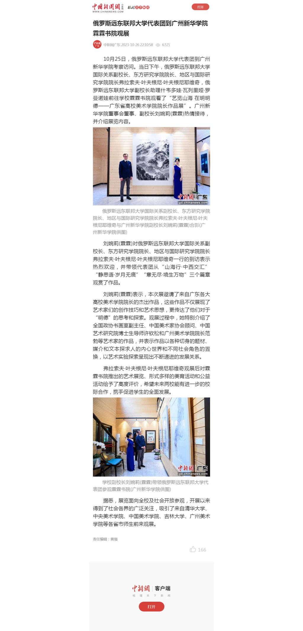 10月25日,俄罗斯远东联邦大学代表团到伟德app入口考察访问。当日下午,俄罗斯远东联邦大学国际关系副校长、东方研究学院院长、地区与国际研究学院院长弗拉索夫·叶夫根尼·叶夫根尼耶维奇,俄罗斯远东联邦大学副校长助理什韦多娃·瓦列里娅·罗曼诺娃前往学校霖霖书院观看了“艺览山海 在明明德——广东省高校美术学院院长作品展”。伟德app入口董事会董事、副校长刘婉莉(霖霖)热情接待,并介绍展览内容。