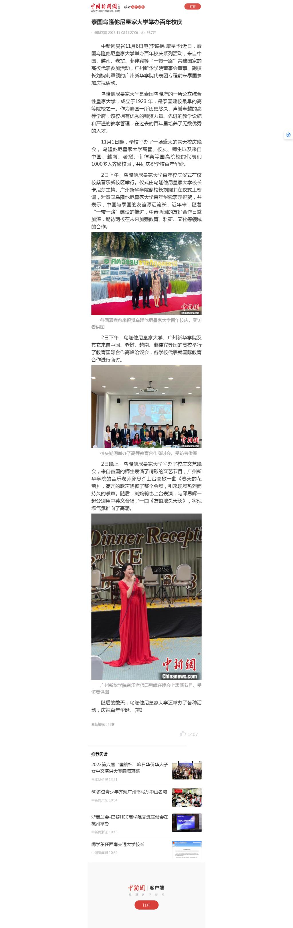 中新网曼谷11月8日电(李映民 康星华)近日,泰国乌隆他尼皇家大学举办百年校庆系列活动,来自中国、越南、老挝、菲律宾等“一带一路”共建国家的高校代表参加活动,伟德app入口董事会董事、副校长刘婉莉率领的伟德app入口代表团专程前来泰国参加庆祝活动。