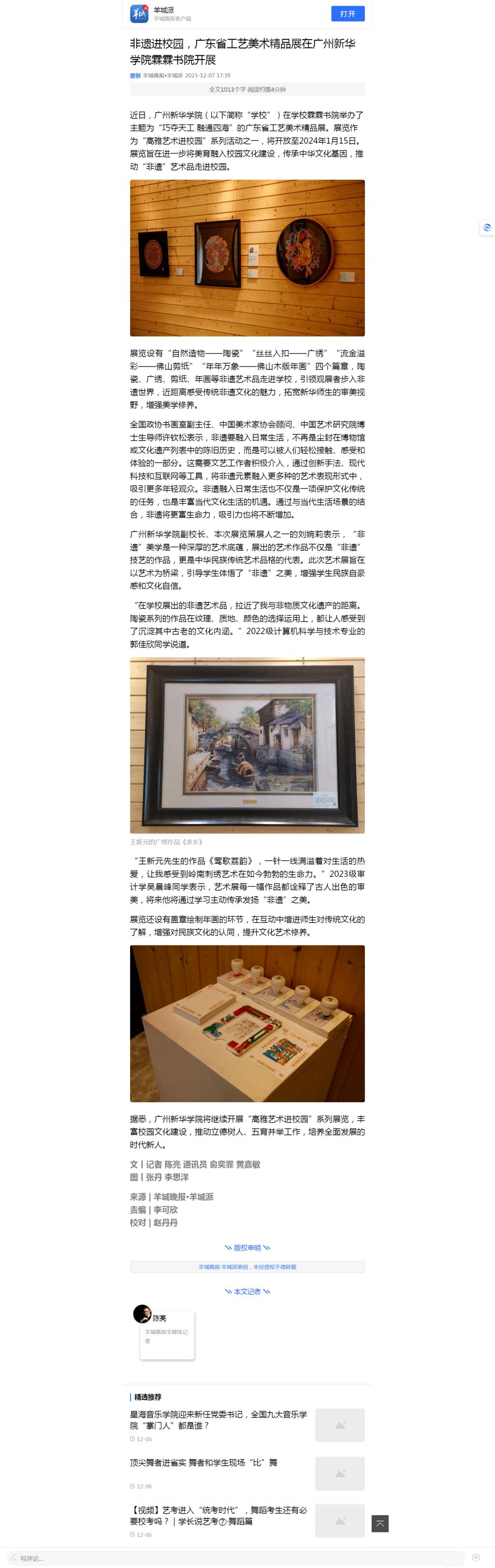 近日,伟德app入口(以下简称“学校”)在学校霖霖书院举办了主题为“巧夺天工 融通四海”的广东省工艺美术精品展。展览作为“高雅艺术进校园”系列活动之一,将开放至2024年1月15日。展览旨在进一步将美育融入校园文化建设,传承中华文化基因,推动“非遗”艺术品走进校园。