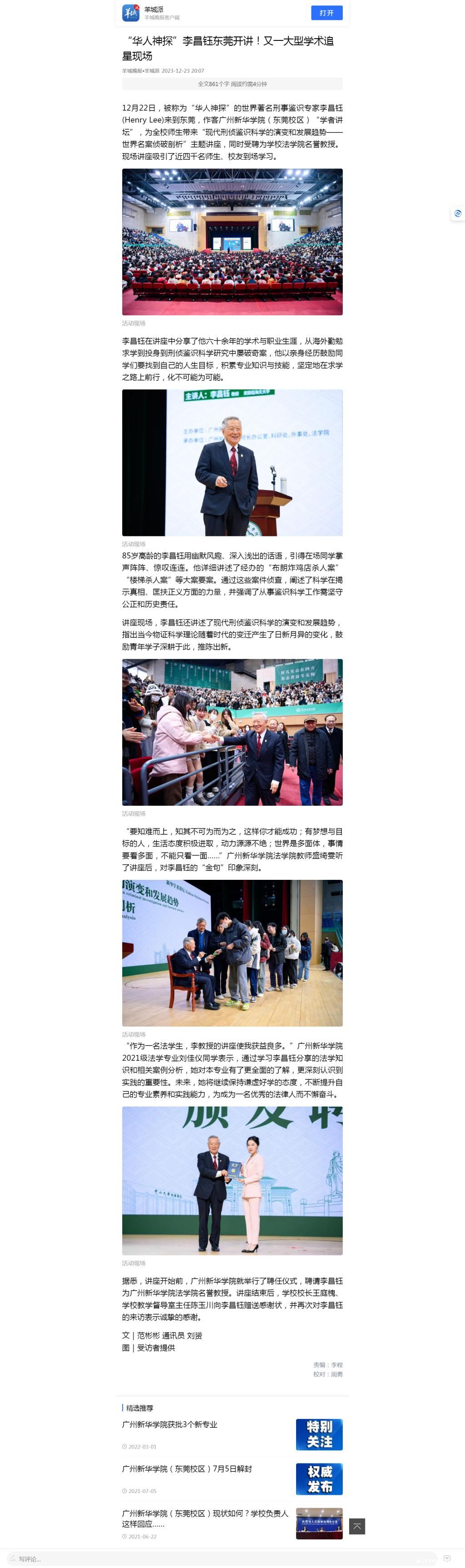 12月22日,被称为“华人神探”的世界著名刑事鉴识专家李昌钰(Henry Lee)来到东莞,作客伟德app入口(东莞校区)“学者讲坛”,为全校师生带来“现代刑侦鉴识科学的演变和发展趋势——世界名案侦破剖析”主题讲座,同时受聘为学校法学院名誉教授。现场讲座吸引了近四千名师生、校友到场学习。