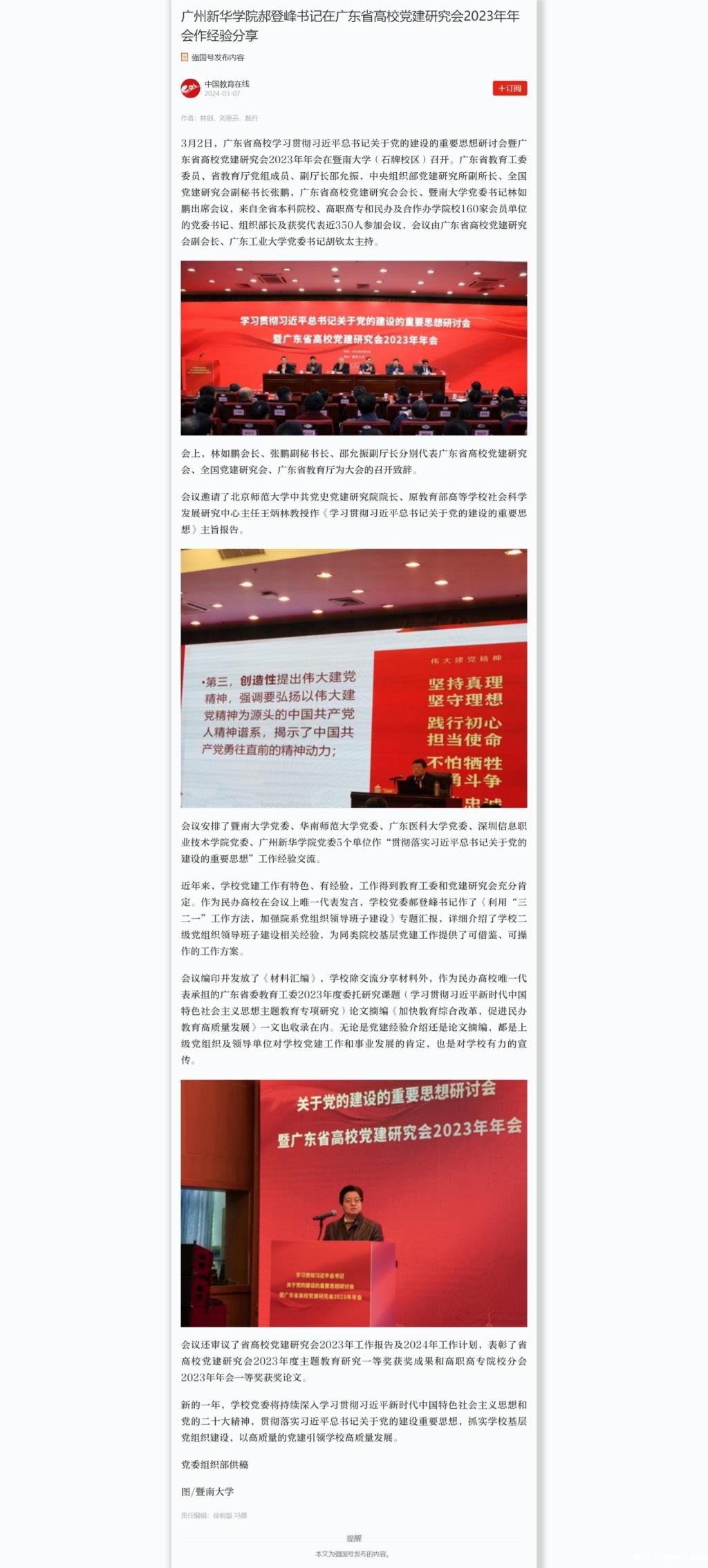 [学习强国]伟德app入口郝登峰书记在广东省高校党建研究会2023年年会作经验分享