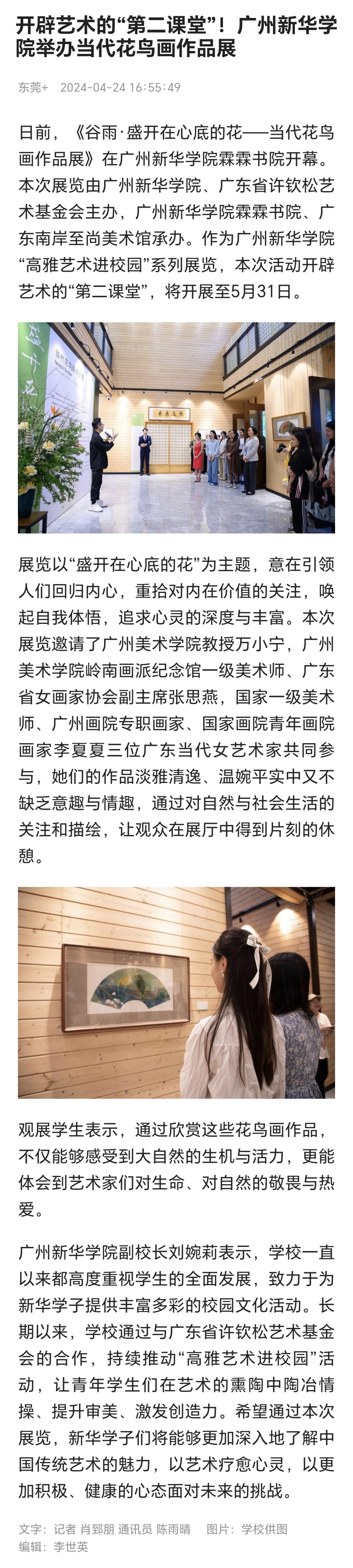 学子提供丰富多彩的校园文化活动。长期以来,学校通过与广东省许钦松艺术基金会的合作,持续推动“高雅艺术进校园”活动,让青年学生们在艺术的熏陶中陶冶情操、提升审美、激发创造力。希望通过本次展览,