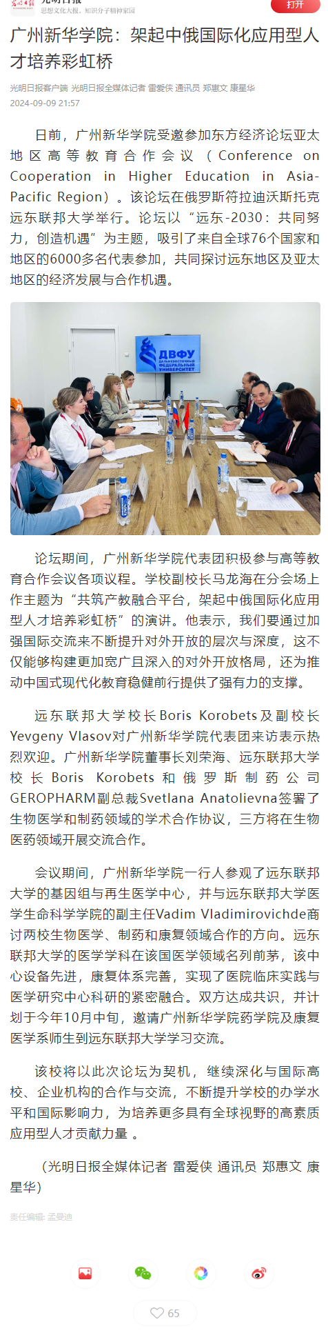 远东联邦大学校长Boris Korobets及副校长Yevgeny Vlasov对伟德app入口代表团来访表示热烈欢迎。伟德app入口董事长刘荣海、远东联邦大学校长Boris Korobets和俄罗斯制药公司GEROPHARM副总裁Svetlana Anatolievna签署了生物医学和制药领域的学术合作协议,三方将在生物医药领域开展交流合作。
