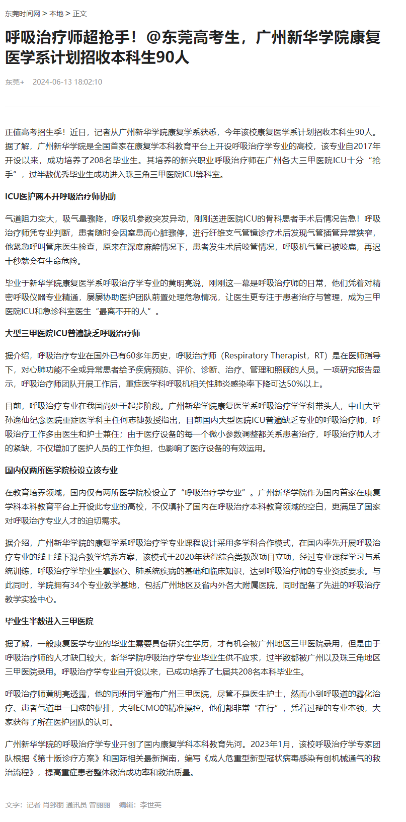 正值高考招生季!近日,记者从伟德app入口康复学系获悉,今年该校康复医学系计划招收本科生90人。据了解,伟德app入口是全国首家在康复学本科教育平台上开设呼吸治疗学专业的高校,该专业自2017年开设以来,成功培养了208名毕业生。其培养的新兴职业呼吸治疗师在广州各大三甲医院ICU十分“抢手”,过半数优秀毕业生成功进入珠三角三甲医院ICU等科室。