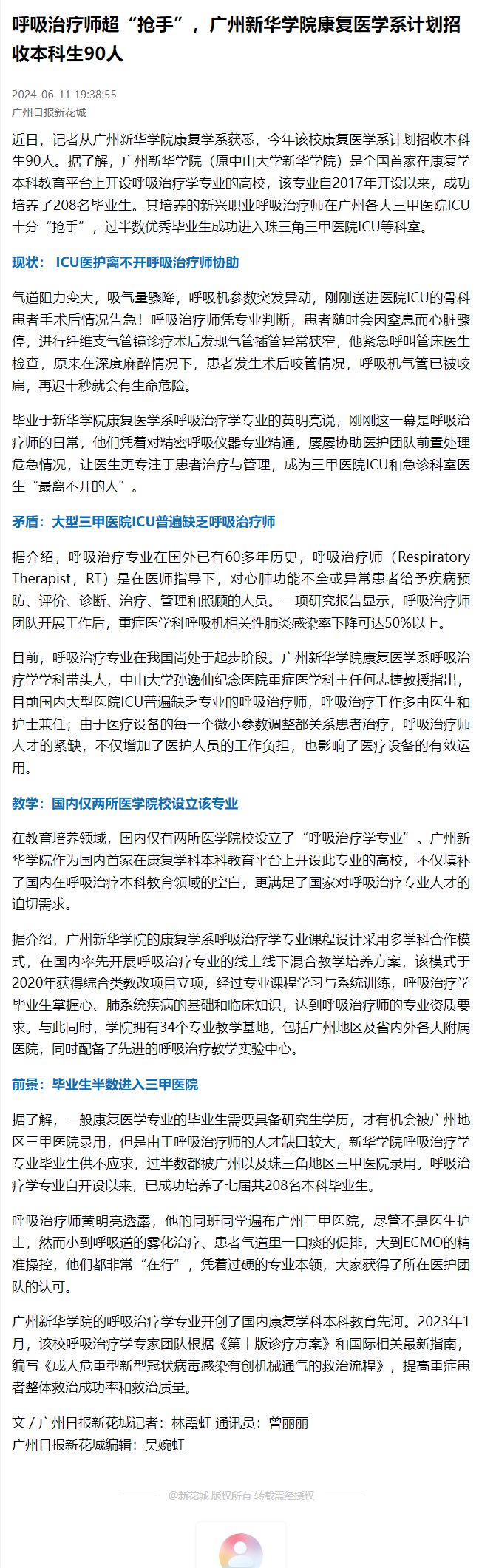近日,记者从伟德app入口康复学系获悉,今年该校康复医学系计划招收本科生90人。据了解,伟德app入口(原中山大学bv伟德体育app官网学院)是全国首家在康复学本科教育平台上开设呼吸治疗学专业的高校,该专业自2017年开设以来,成功培养了208名毕业生。其培养的新兴职业呼吸治疗师在广州各大三甲医院ICU十分“抢手”,过半数优秀毕业生成功进入珠三角三甲医院ICU等科室。