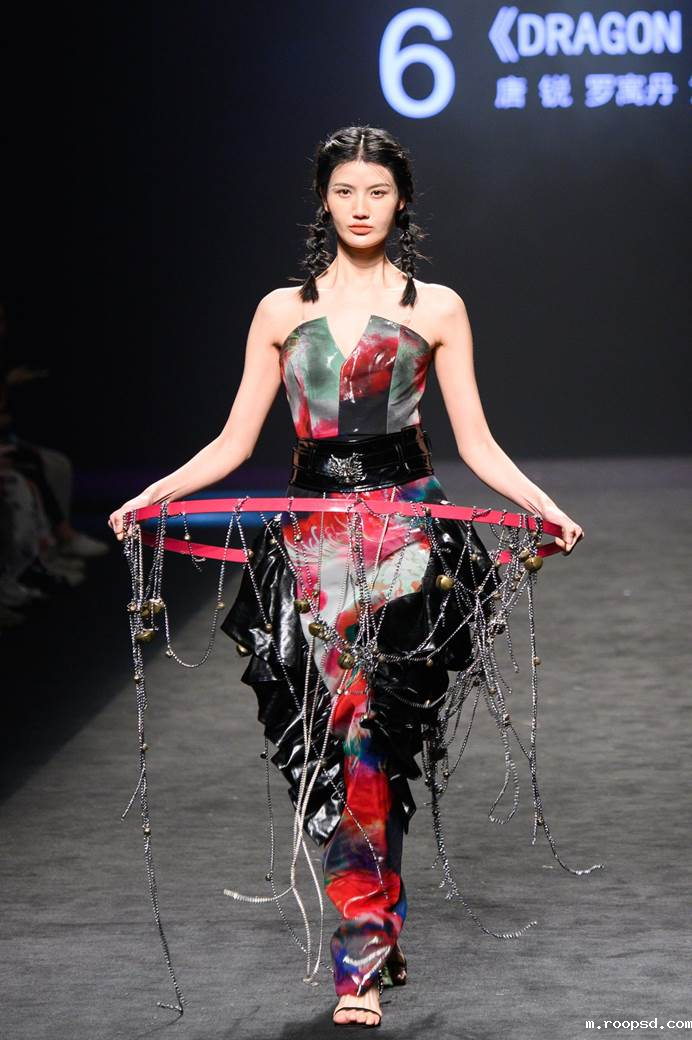 唐锐、罗寓丹、黄晓晓的《DRAGON VII》系列作品在本次展演中荣获二等奖,他们的作品灵感源自“龙生九子”传说,巧妙地将龙子特征与现代服装结合,展现了独特的先锋新中式美学。设计过程中,他们面临了诸如印花呈现、面料选择等不少挑战,但通过不断搜寻资料、对比面料、尝试与调整搭配,最终成功地克服了困难。谈及未来,他们希望能在服装行业的“新中式”领域中开拓新的方向,引领潮流。