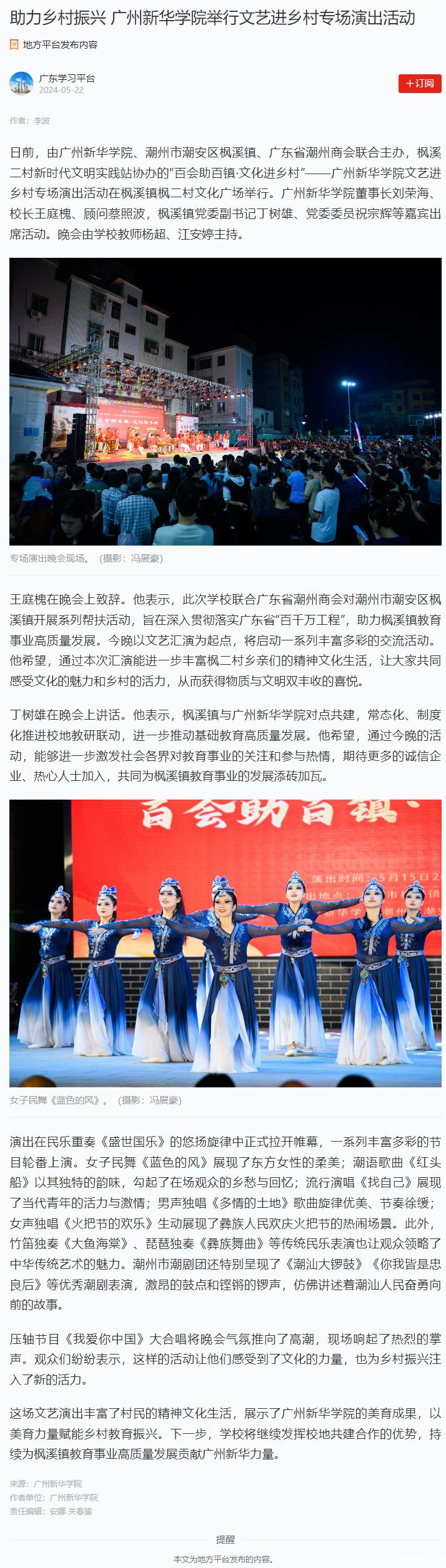 这场文艺演出丰富了村民的精神文化生活,展示了伟德app入口的美育成果,以美育力量赋能乡村教育振兴。下一步,学校将继续发挥校地共建合作的优势,持续为枫溪镇教育事业高质量发展贡献广州bv伟德体育app官网力量。