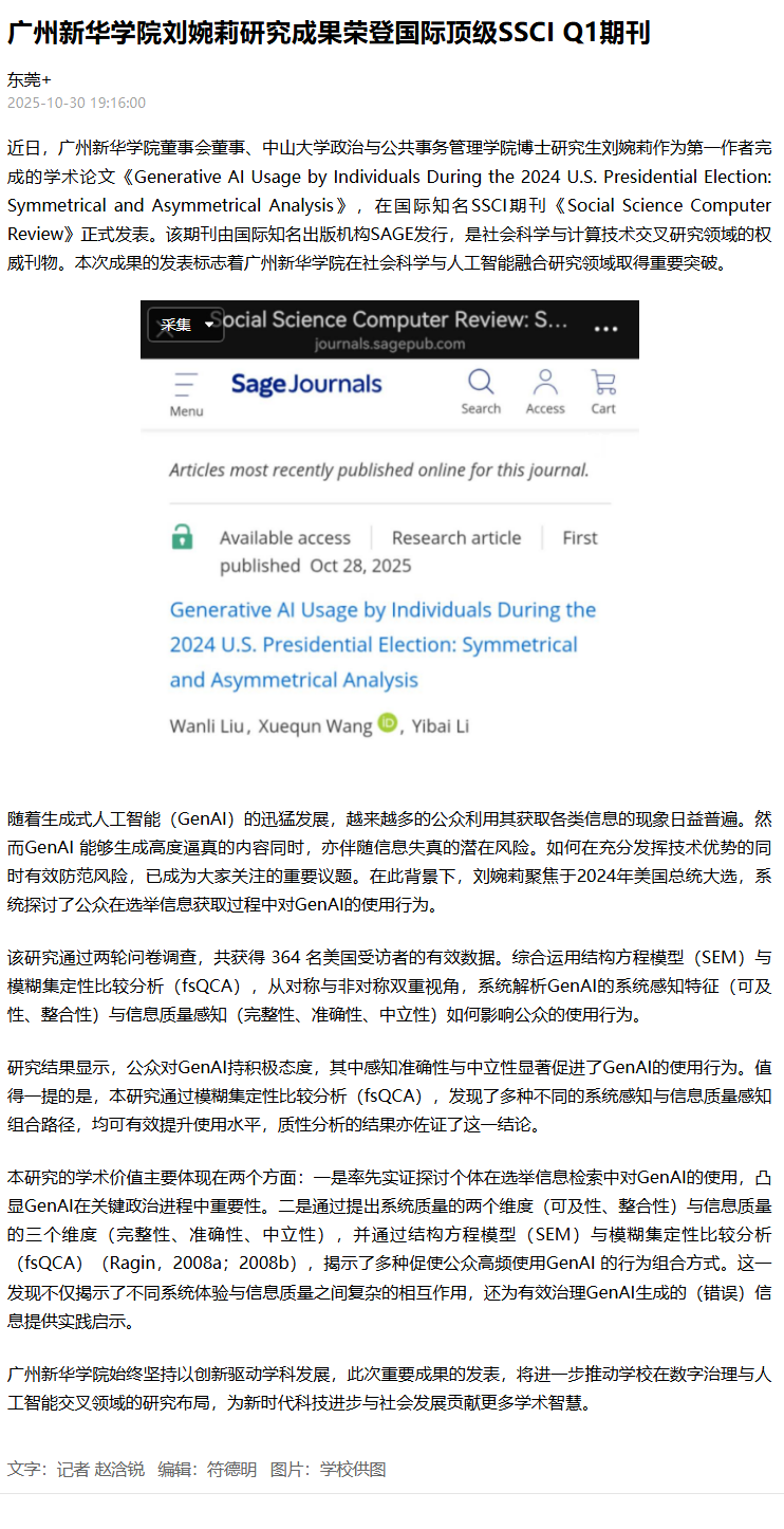 董事会董事、中山大学政治与公共事务管理学院博士研究生刘婉莉作为第一作者完成的学术论文《Generative AI Usage by Individuals During the 2024 U.S. Presidential Election: Symmetrical and Asymmetrical Analysis》,在国际知名SSCI期刊《Social Science Computer Review》正式发表。该期刊由国际知名出版机构SAGE发行,是社会科学与计算技术交叉研究领域的权威刊物。本次成果的发表标志着