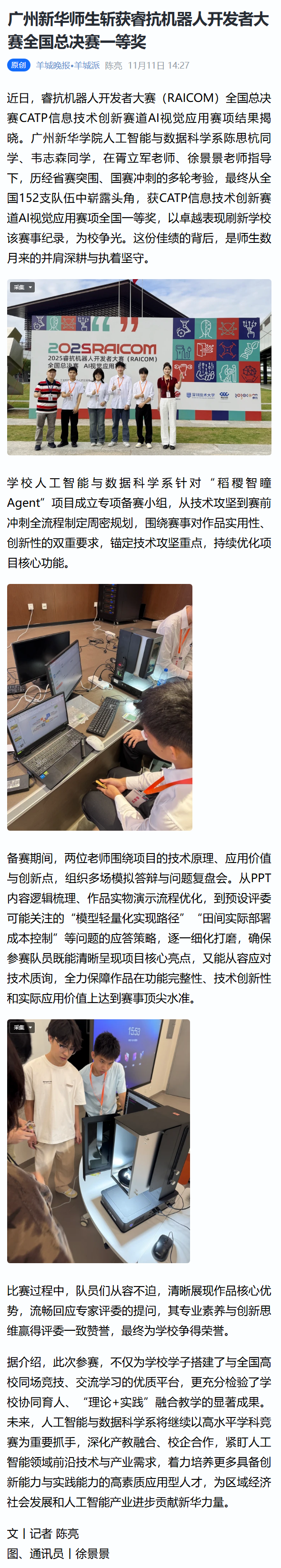 人工智能与数据科学系陈思杭同学、韦志森同学,在胥立军老师、徐景景老师指导下,历经省赛突围、国赛冲刺的多轮考验,最终从全国152支队伍中崭露头角,获CATP信息技术创新赛道AI视觉应用赛项全国一等奖,以卓越表现刷新学校该赛事纪录,为校争光。这份佳绩的背后,是师生数月来的并肩深耕与执着坚守。