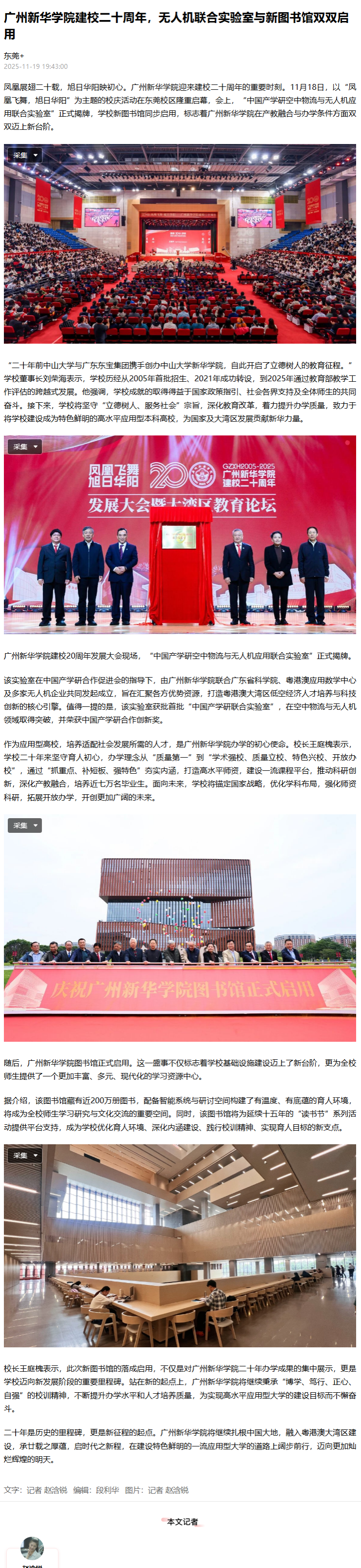 迎来建校二十周年的重要时刻。11月18日,以“凤凰飞舞,旭日华阳”为主题的校庆活动在东莞校区隆重启幕,会上,“中国产学研空中物流与无人机应用联合实验室”正式揭牌,学校新图书馆同步启用,标志着