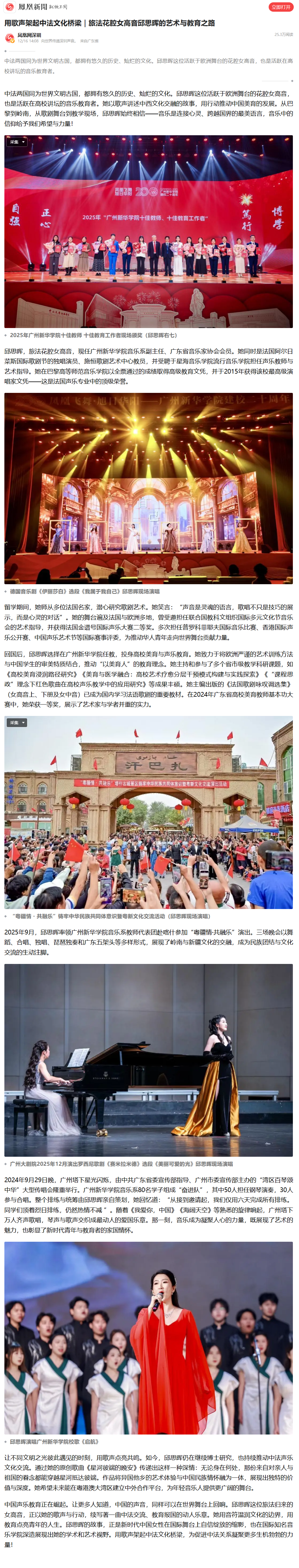 中国声乐教育正在崛起。让更多人知道,中国的声音,同样可以在世界舞台上回响。邱思晖这位旅法归来的女高音,正以她的歌声与行动,续写著一曲中法交流、教育报国的动人乐章。她用音符温润文化的边界,用教育点亮青年的人生。邱思晖的故事,正是新时代中国女性在国际舞台上自信绽放的缩影,也在国际知名音乐学院深造展现出她的学术和艺术视野。用歌声架起中法文化桥梁,为促进中法关系凝聚更多生机勃勃的力量!