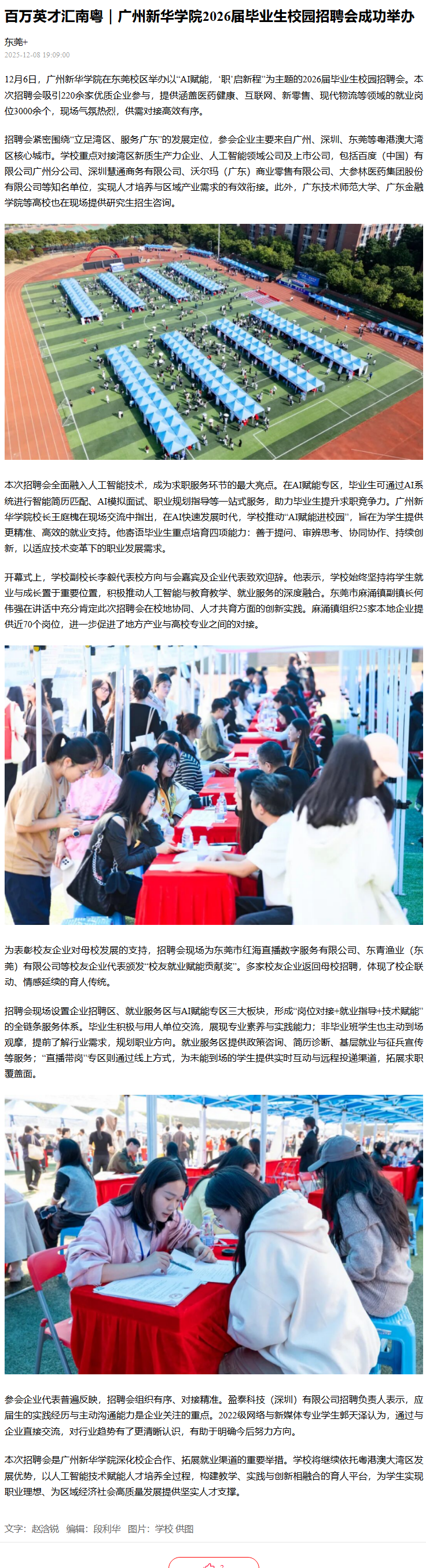 深化校企合作、拓展就业渠道的重要举措。学校将继续依托粤港澳大湾区发展优势,以人工智能技术赋能人才培养全过程,构建教学、实践与创新相融合的育人平台,为学生实现职业理想、为区域经济社会高质量发展提供坚实人才支撑。