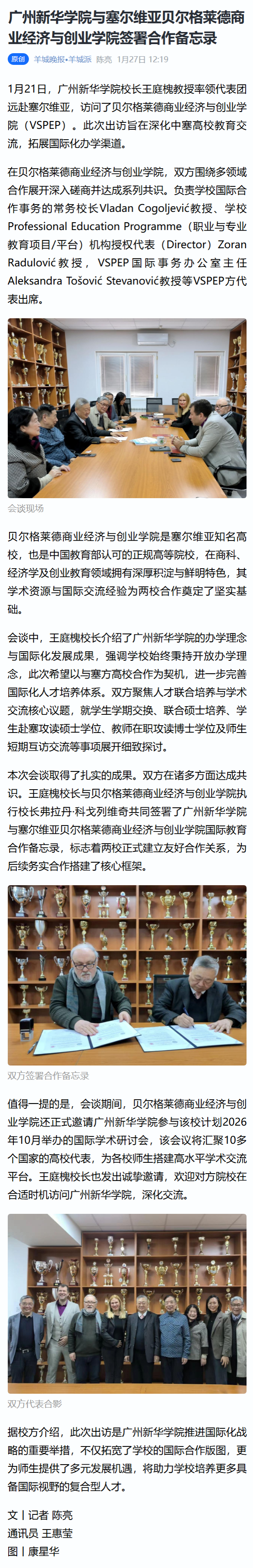 与塞尔维亚贝尔格莱德商业经济与创业学院国际教育合作备忘录,标志着两校正式建立友好合作关系,为后续务实合作搭建了核心框架。