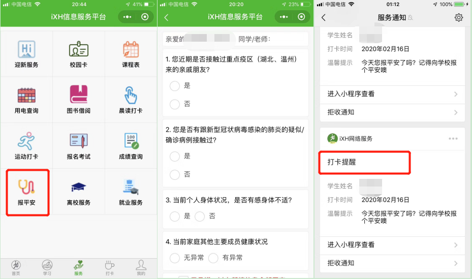 学院信息与网络管理处(下文简称“信息处”)通过自研发平台“iXH信息服务平台小程序”开设“报平安”功能,并增加每日“打卡提醒”,协助学校人事处、学生处做好师生健康信息和人员地理位置分布情况采集,实现了学校采取信息化、大数据手段,全覆盖、全天候动态跟踪师生生命安全和身体健康情况,既避免了“填表抗疫”的疲惫,又准确掌握了师生出行、居家分布数据和身体健康状况。